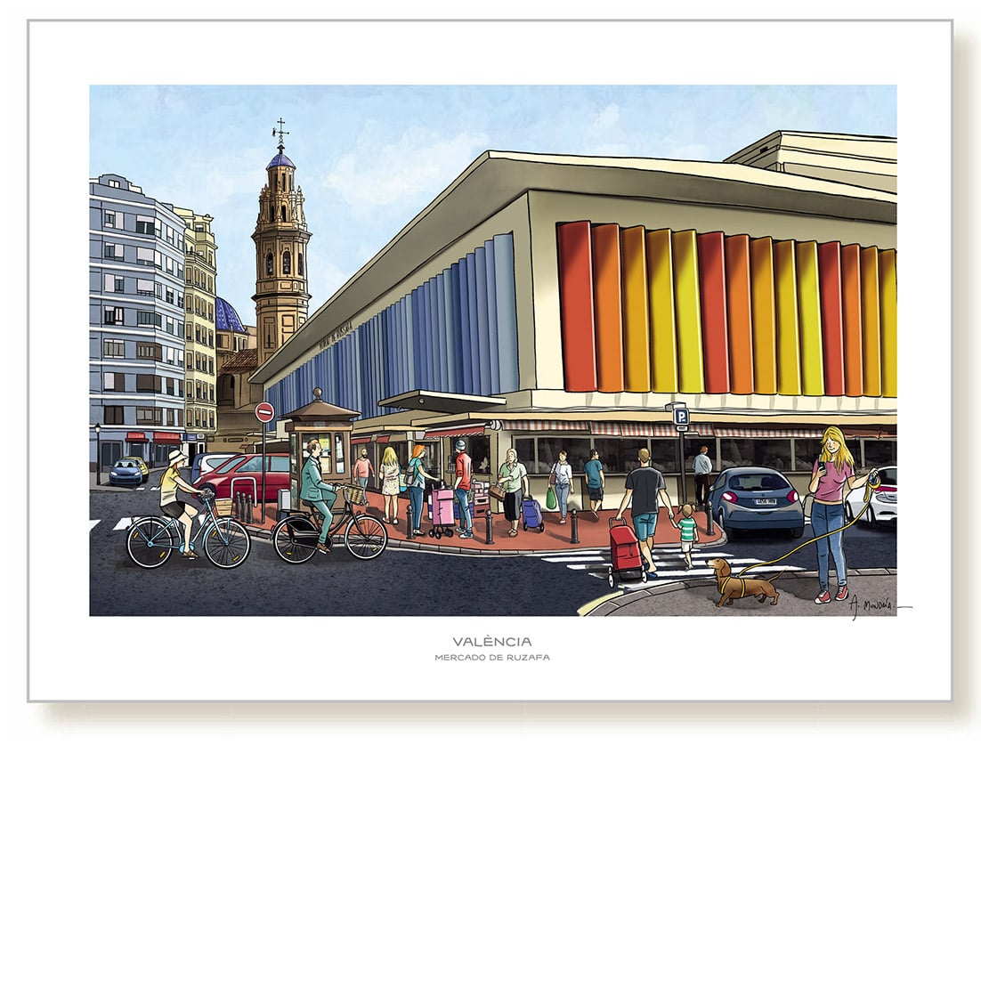 Situado en pleno corazón del barrio, junto a la iglesia barroca de San Valero, se encuentra el mercado de Ruzafa, con su característica fachada; un estallido de alegría y color que convierte el edificio funcional de los años 50 en un icono vibrante. Grandes planos de colores puros —amarillos solares, azules eléctricos, verdes manzana y naranjas vibrantes— se intercalan representando la diversidad y la energía creativa que bullen en su interior. Toda una declaración de intenciones, un aviso de que aquí no se viene solo a comprar, sino también a experimentar.